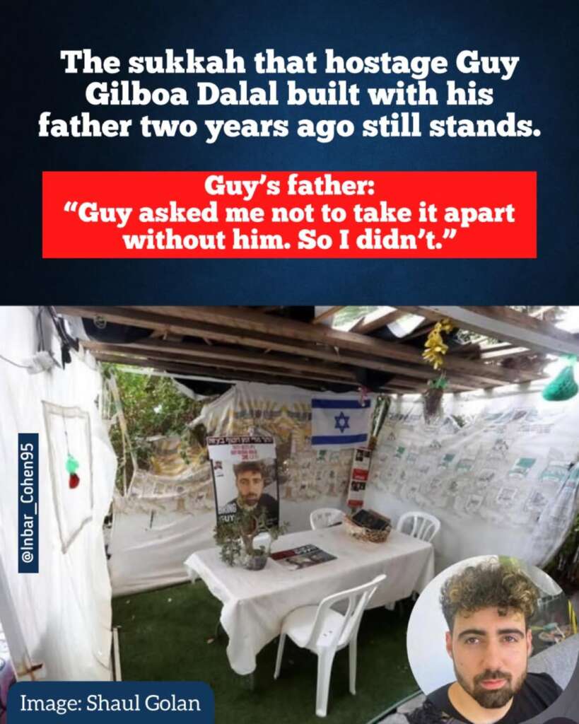 For two years, his family kept the sukkah standing as a tangible expression of their hope that Guy would return. Weathering wind, rain, and the anguish of two terrible years, they kept their sukkah up in the hope that they could fulfill their promise to take it down together. Now, there is a real possibility that Guy will indeed return home at the end of Sukkot two years later, that he will sit with his family in that same sukkah he left behind when he went to the Nova Festival. That, together, they will finally take it down.